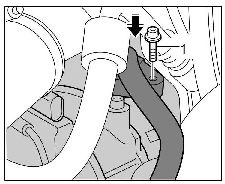 3. Plug in the refrigerant line from the compressor on the pressure damper (do not tilt) and screw down with the fastening screw -1-. => Tightening torque: 9 ftlb.