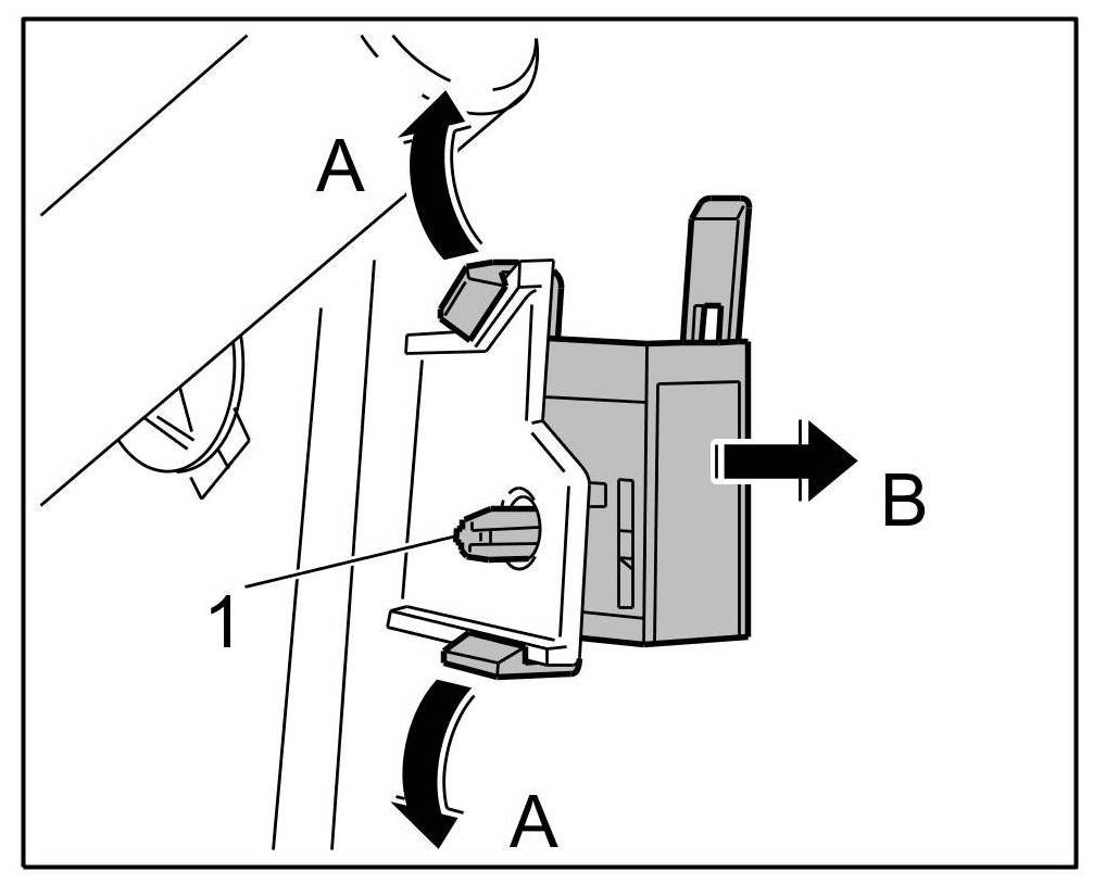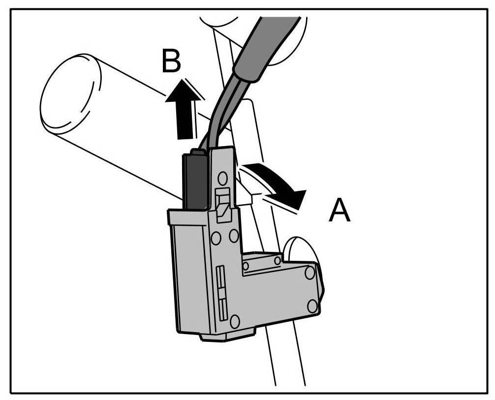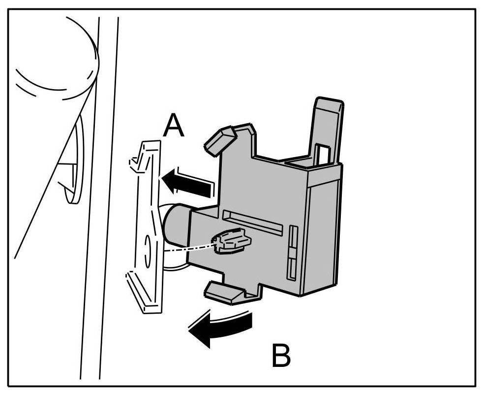 1. Insert contact switch into the bore -Arrow A- and screw it into the bracket -Arrow B- until the locking tabs are felt to engage.