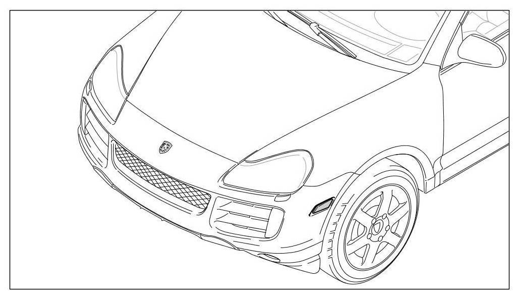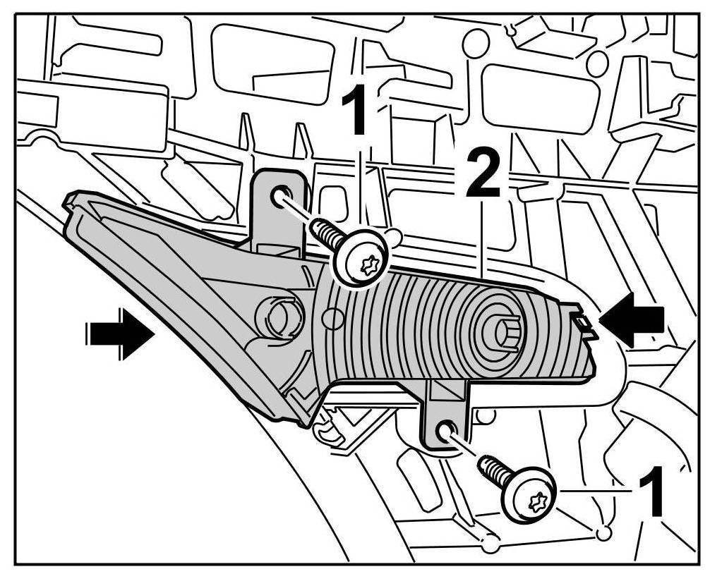 1.1. Insert side direction indicator light -2- from the rear in -direction of arrow- into the front apron until the clip -arrow- engages securely.