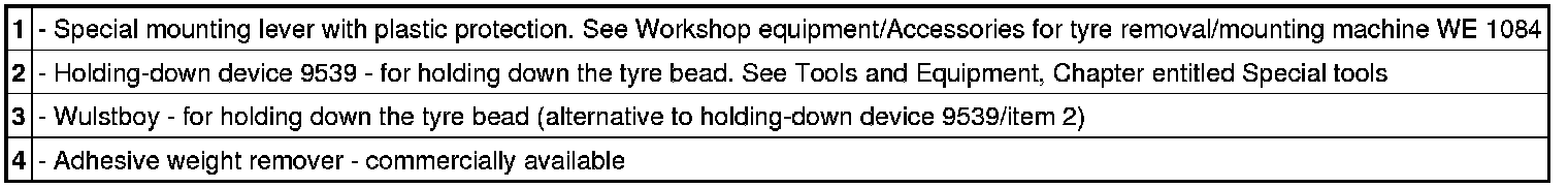 Only use recommended tyre removal/mounting machine and auxiliary equipment (special mounting lever, bead holding-down device). Refer to Tools and Equipment.