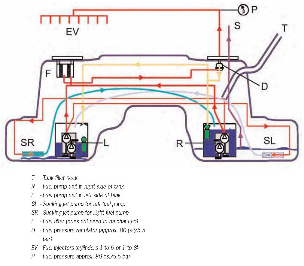 The fuel tank is not symmetrical. The left half of the tank has a higher volume than the right side. There is a "hump" in the middle so that both chambers are separated from each other once a certain fuel level is reached in the tank. When the tank is half full, the left fuel pump is activated because the left half of the tank has the higher volume. The fuel pumps are each supplied by one sucking jet pump whose hoses are routed diagonally and which "helps itself" to fuel from the other half of the tank.