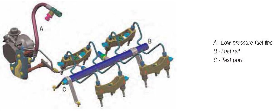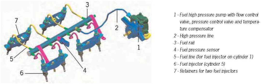 The fuel high pressure system generates an injection pressure of up to 1740 psi (120 bar) in the combustion chamber. The components of the V6 engine and the V8 engines are different.