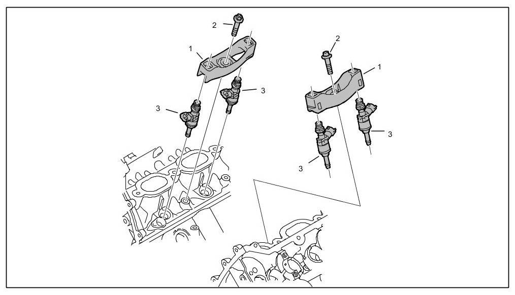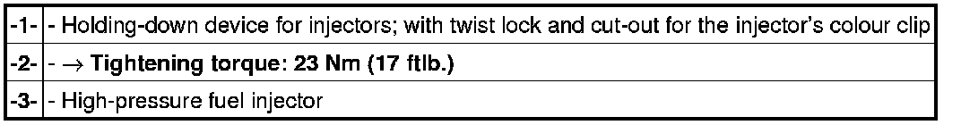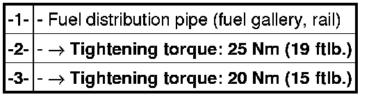 7. Fit high-pressure distribution pipe (high-pressure rail) and tighten it to the correct tightening torques. => 243019 Removing and installing fuel distribution pipe (fuel rail) on DFI engines - section on "Installing"