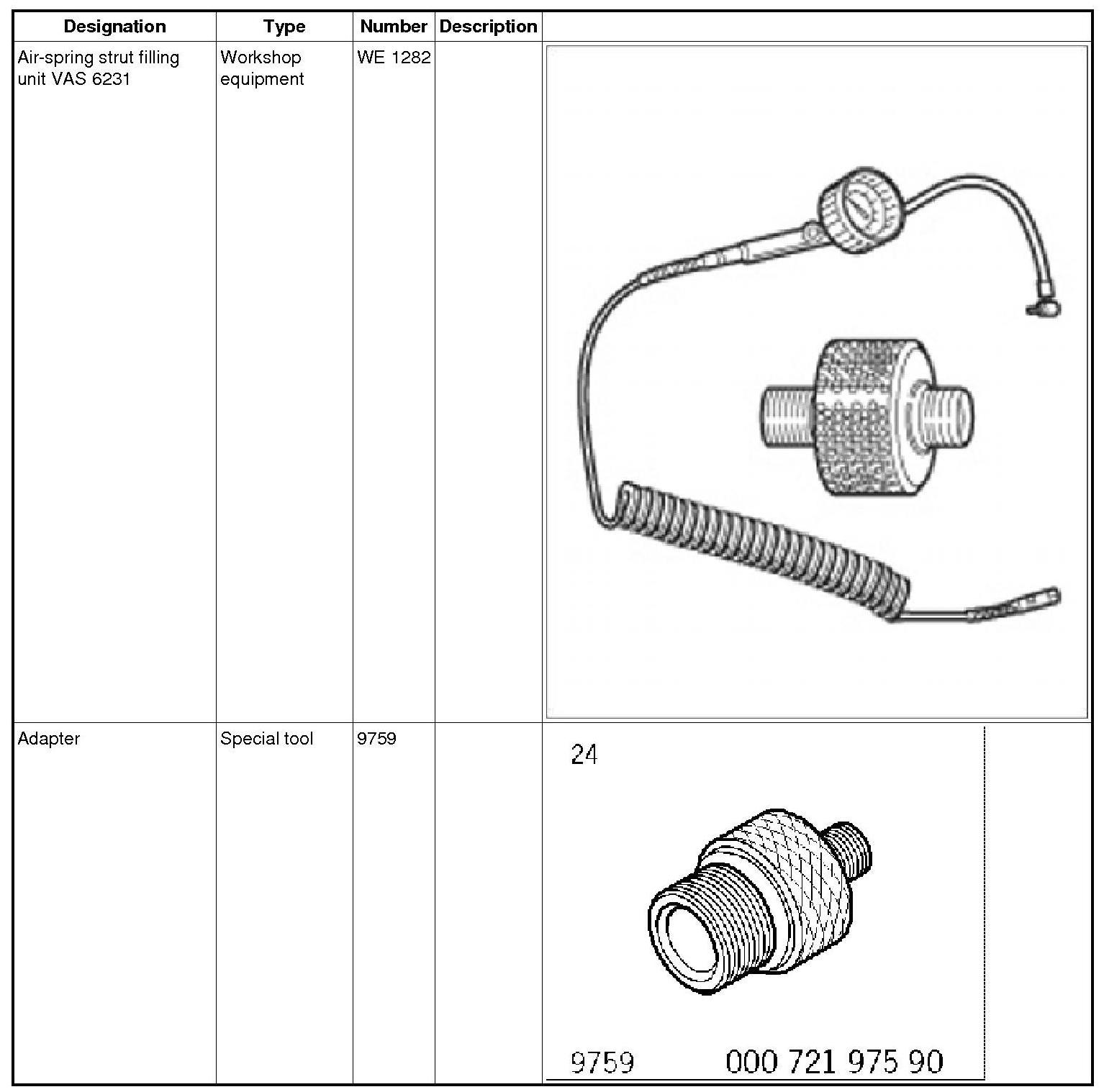 4. Air-spring strut filling unit VAS 6231 WE 1282 must then be connected to the adapter 9759 ( -1- ). Tighten the connection if necessary.