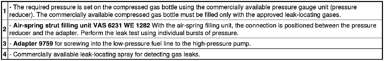 3. Fit test gas bottle with pressure reducer and air-spring strut filling unit VAS 6231 WE 1282 securely so that no gas can escape => Test equipment setup. Set pressure reducer to max. 10 bar pressure => Adjusting pressure reducer to between 7 and 9 bar of test gas pressure.