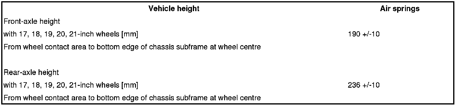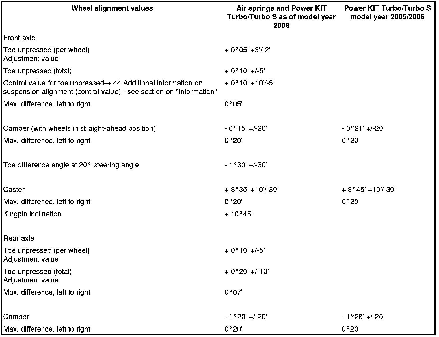 - Only the alignment values that deviate from the values in the "Air springs and Power KIT Turbo/Turbo S as of model year 2008" column are displayed in the "Power KIT Turbo/Turbo S model year 2005/2006" column. The values that are not shown are identical to those in the "Air springs and Power KIT Turbo/Turbo S as of model year 2008" column.