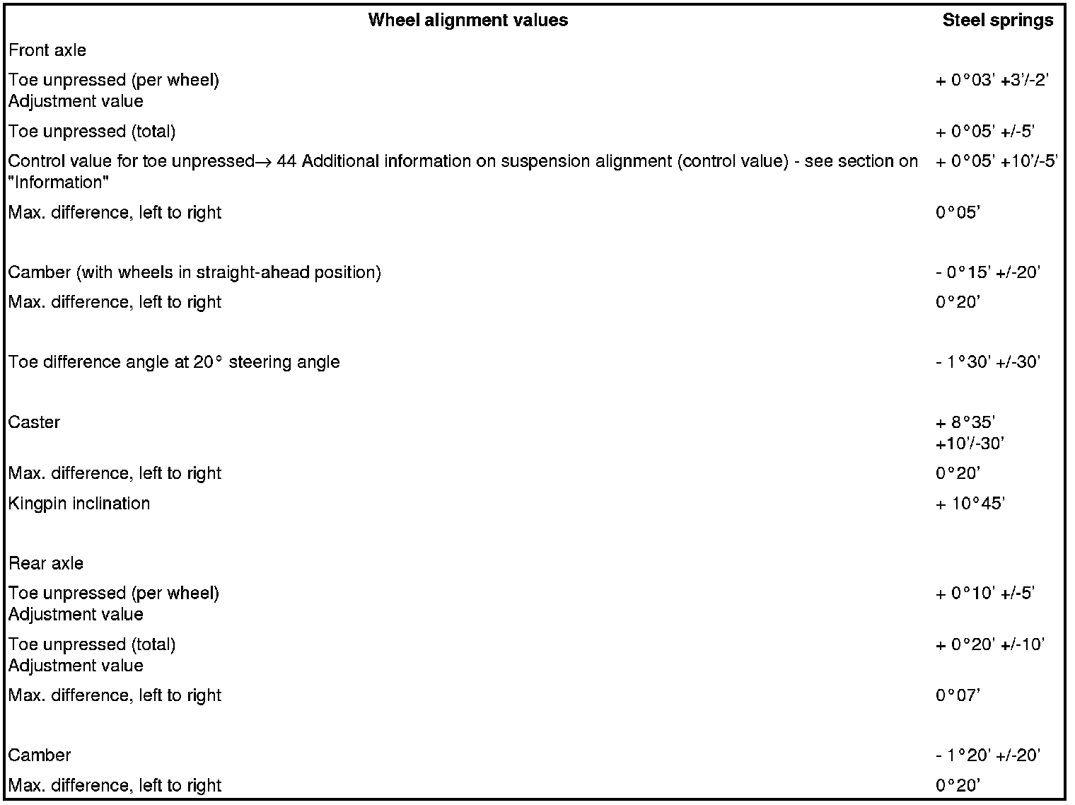 See requirements for suspension alignment. -> 44 Additional information on suspension alignment (control value) - section on "Information"