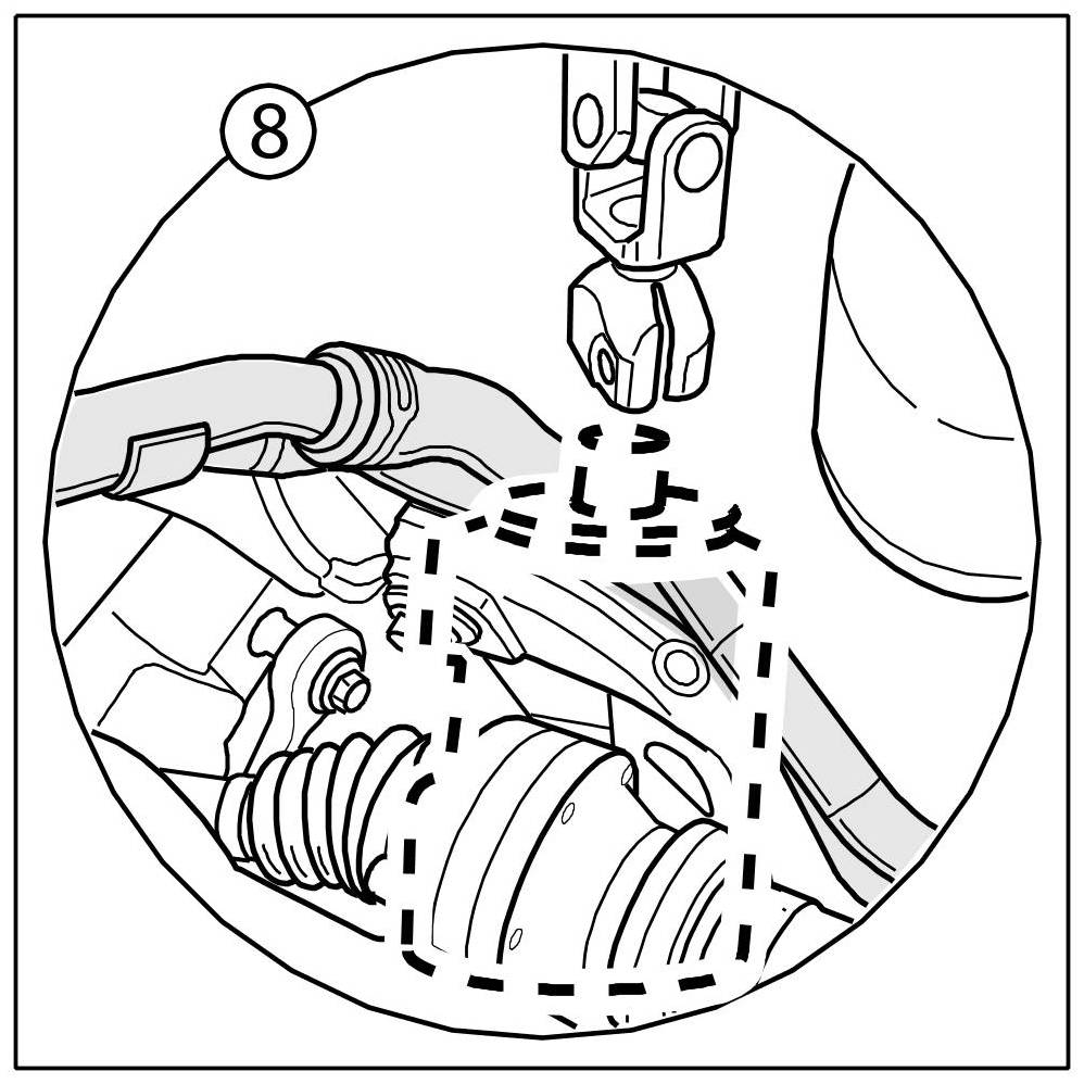 9. Remove heat shield and push steering gear -see figure- to the right, out of the subframe mounting points, and turn to the rear.