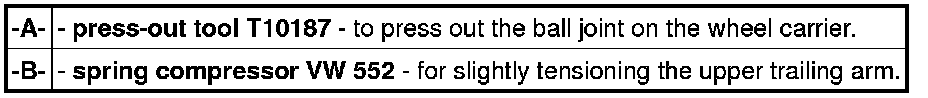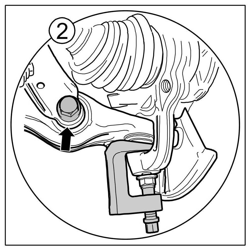 3. Loosen the fastening nuts => see figure from the bottom ball joint and press off with the press-out tool T10187. When doing this, leave fastening nut flush on ball journal, so as not to damage thread.
