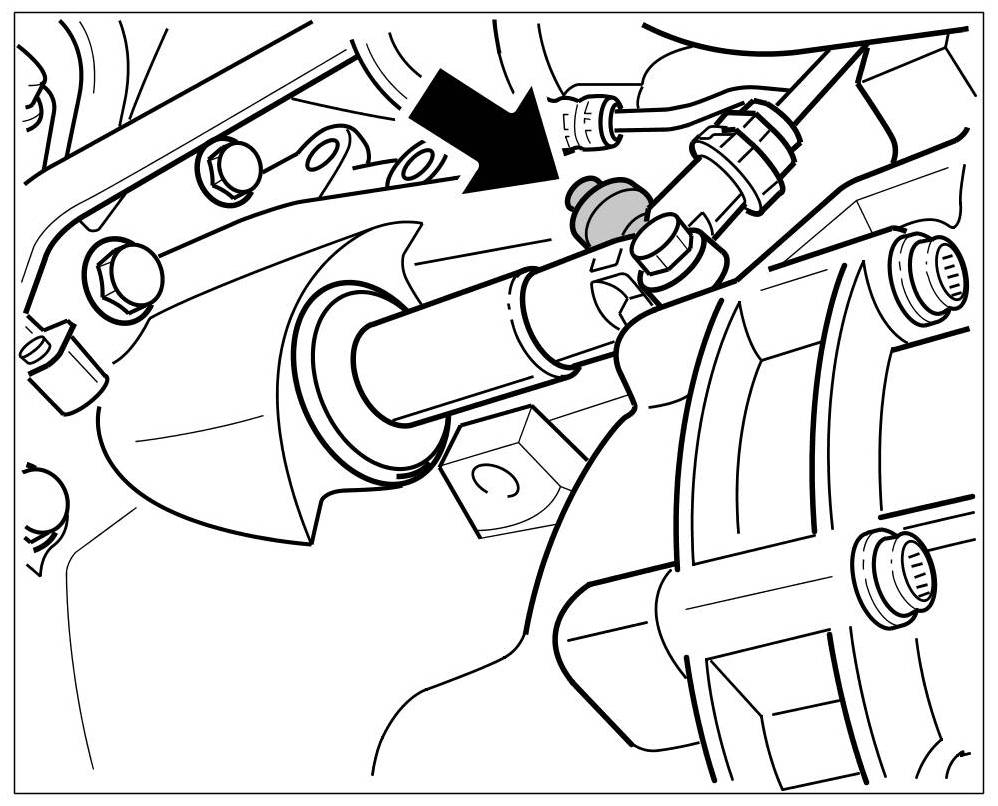4. Open the bleeder valve (approx. three turns.) -arrow- until brake fluid emerges. When no air bubbles have been flushed out for at least 10 seconds, press down very quickly on the clutch pedal and then pull it back up again very slowly. Wait for about 10 seconds and then repeat the whole procedure again several times until no more air bubbles are flushed out (the help of a second person is required).