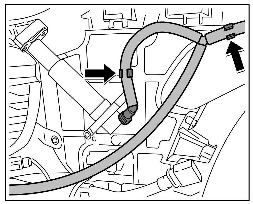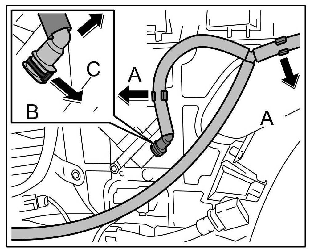 1. Slide in hose on the right side -arrow A- and position it along the electrical wiring harness.