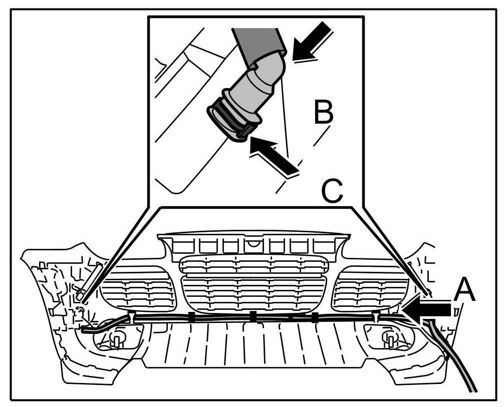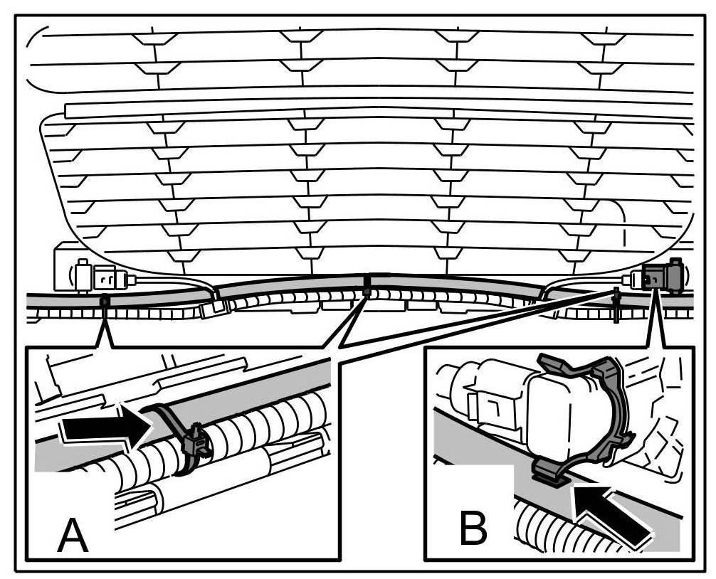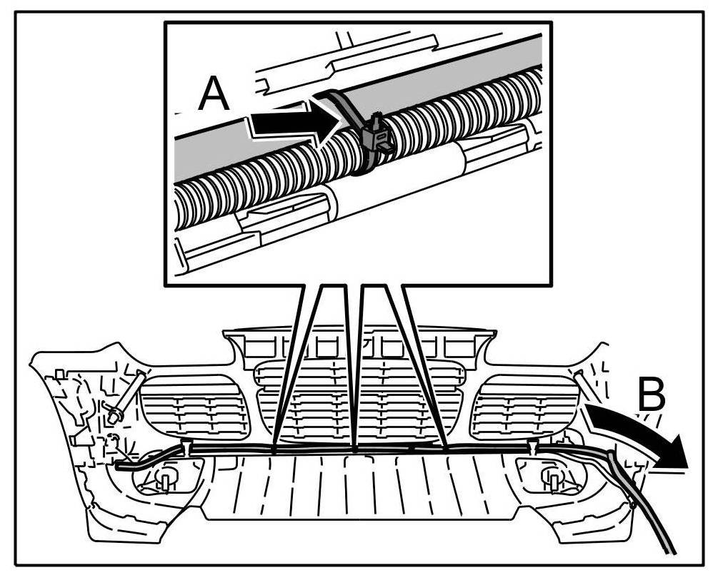 - Before tightening with tie-wraps, make sure hose does not chafe on locking tabs of parking aid -B-.