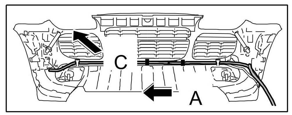 2. Remove retaining clip -arrow B- and pull off the hose on both spray jets -arrow C-.