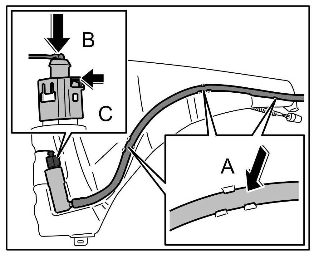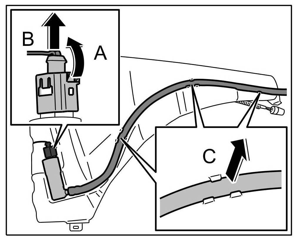 2. Pull out high pressure hose from retaining tabs on tank -Arrow C-.
