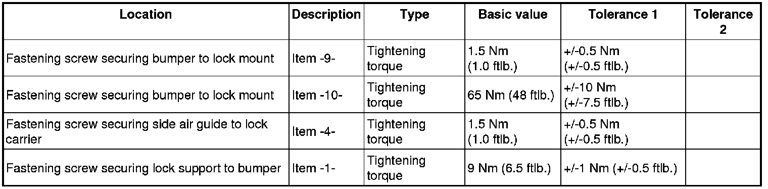 => Tightening torque: 1.5 Nm (1.0 ftlb.)+/-0.5 Nm (+/-0.5 ftlb.) => Tightening torque: 65 Nm (48 ftlb.)+/-10 Nm (+/-7.5 ftlb.)