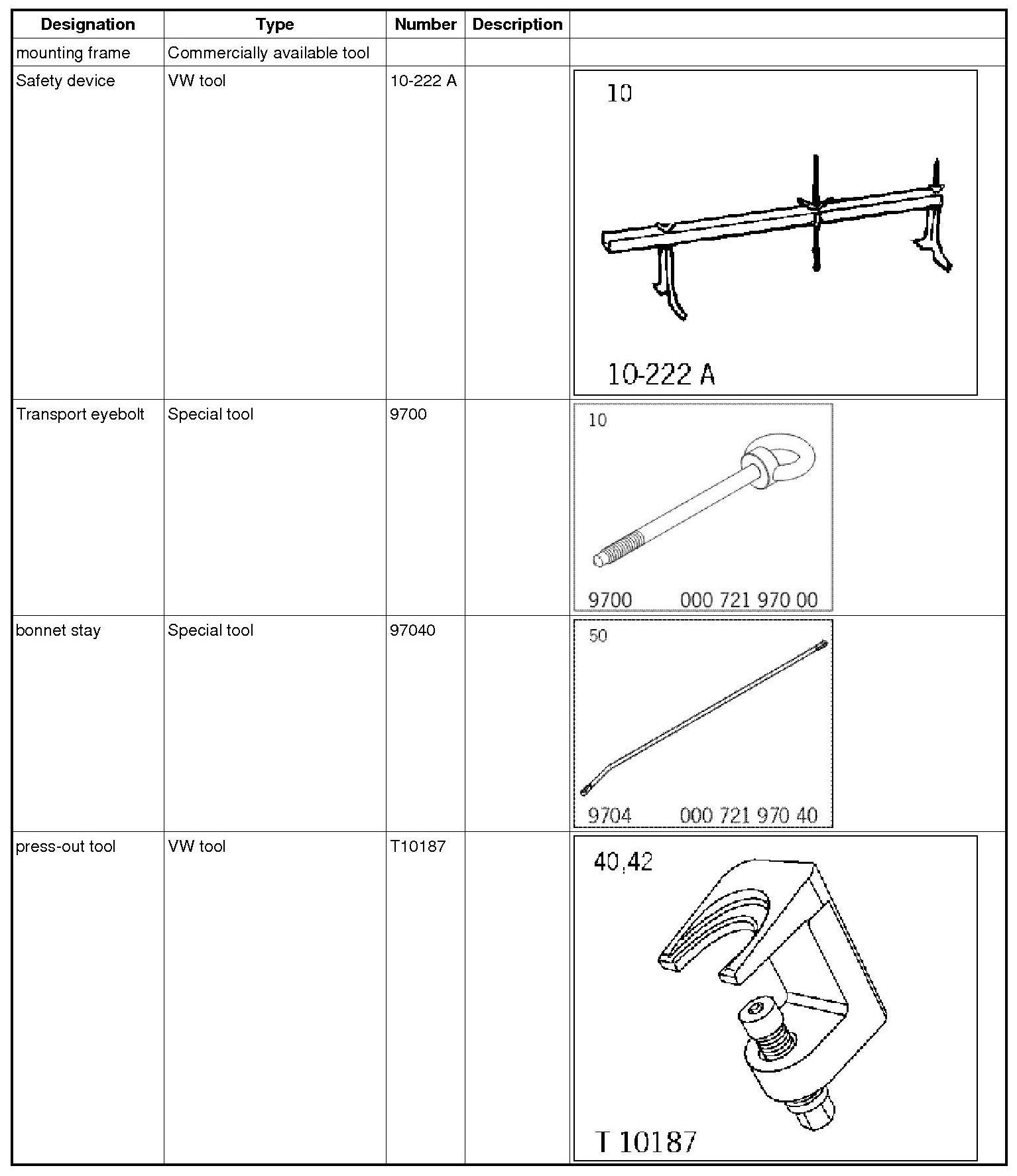 - In Point 4, the transport eyebolt 9700 cannot be screwed in on 2nd generation V8 vehicles. There are perforated plates on the engine for transporting and raising it to the safety device.