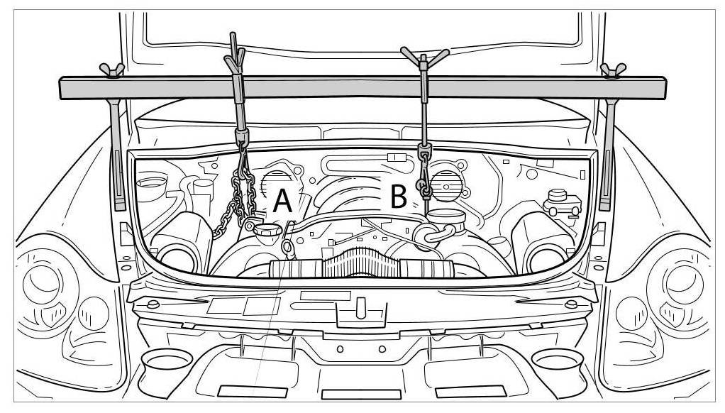 4. Position the safety device 10-222 A correctly and fit the chain to the mounting -A-. Fit the transport eyebolt 9700 for securing the engine -B- (the bore for the transport eyebolt is located between cylinder 6 and 7 on the left cylinder bank).