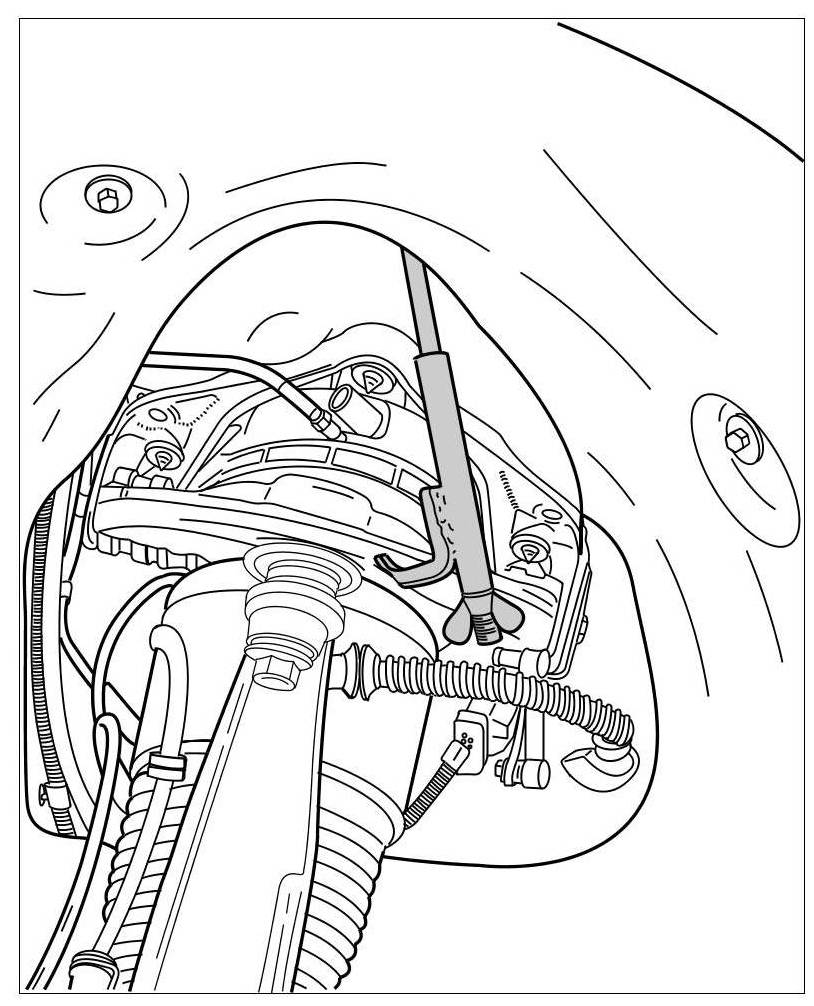 7. Fix upper axle struts with spring compressor VW 552. This involves tensioning the axle strut slightly because otherwise the top ball joint can be damaged. When doing this, engage the -connecting piece- into the top opening of the wheel well (double panel, under the wheel housing cover) and into the axle strut (do not disconnect the air spring connection.).