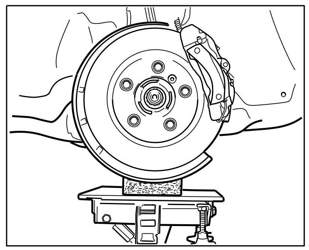 - Do not raise the wheel suspension higher than the normal vehicle position (vehicle resting on wheels). When raising the suspension, use a suitable -intermediate layer (hard rubber)-. Do not damage the brake cover plate.