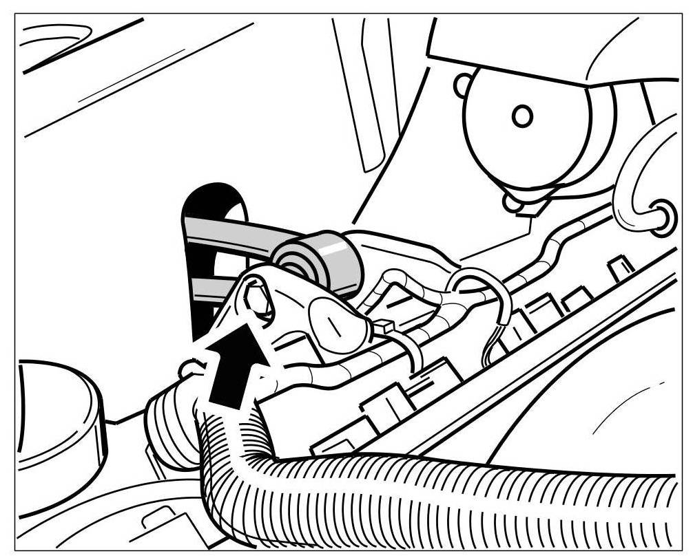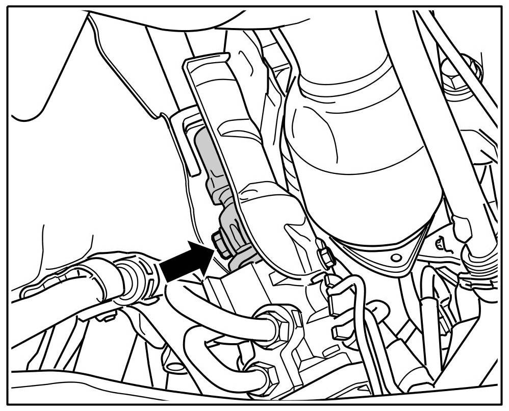 9. The screw in the steering shaft is removed from the wheel well. Release the coolant hoses from the holders on the body. Release the -steering column screw (arrow)- from the steering gear.