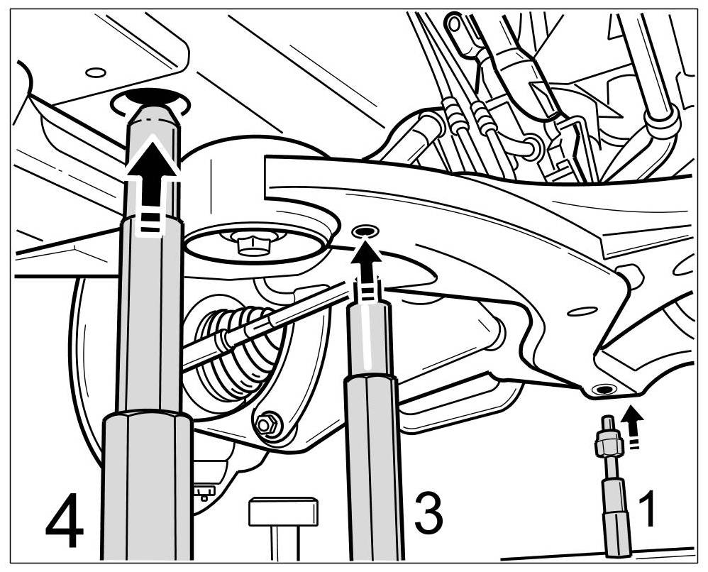 - Fix upper axle strut. The lower control arms are loosened on the front axle carrier and remain with the spring struts in the vehicle.