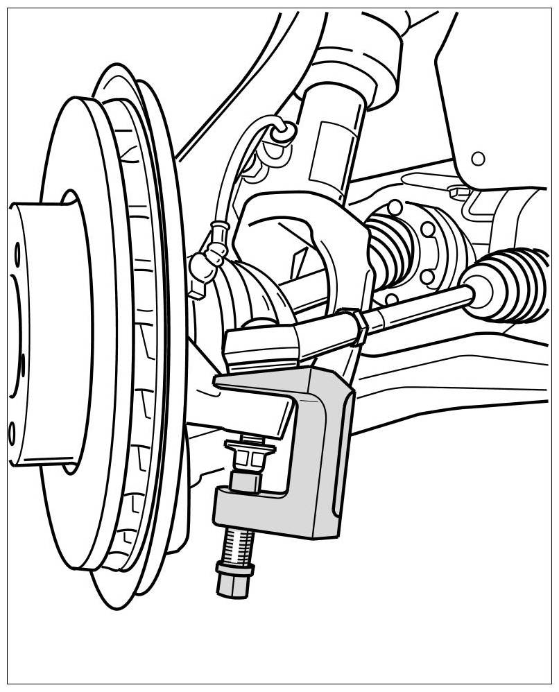 8. For easier removal of the outer tie rod end, swivel the relevant wheel carrier so that the tie rod extends fully. Remove the -outer tie-rod joints- using press-out tool T10187. When pressing out, screw fastening nut on flush (protects the ball joint thread).