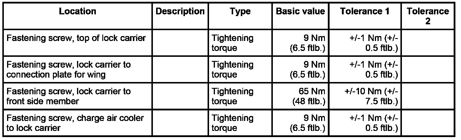 - Tightening torque: 65 Nm (48 ftlb.)+/-10 Nm (+/-7.5 ftlb.)