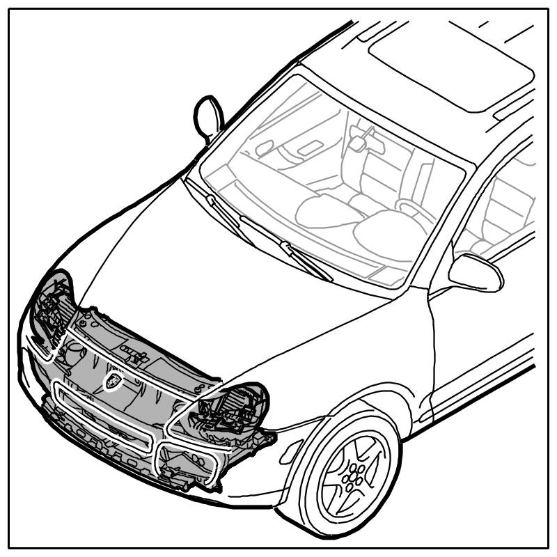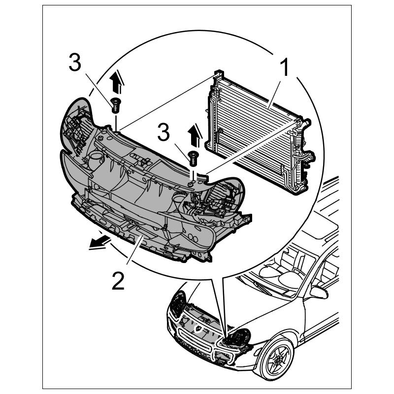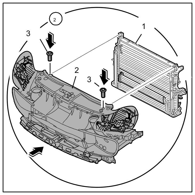 1.1. Remove upper fastening screws -3- on radiator module -arrows- and secure radiator module -1- onto vehicle to prevent it from tipping over or falling.