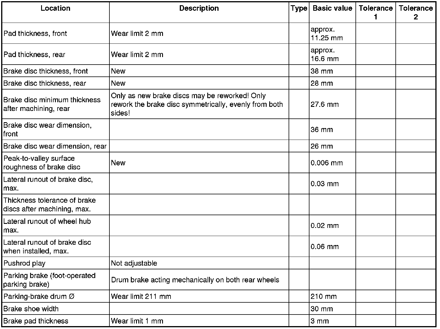 Test Values and Wear Limits For 19" Brake System (Turbo/Turbo S, Model Year 2009)