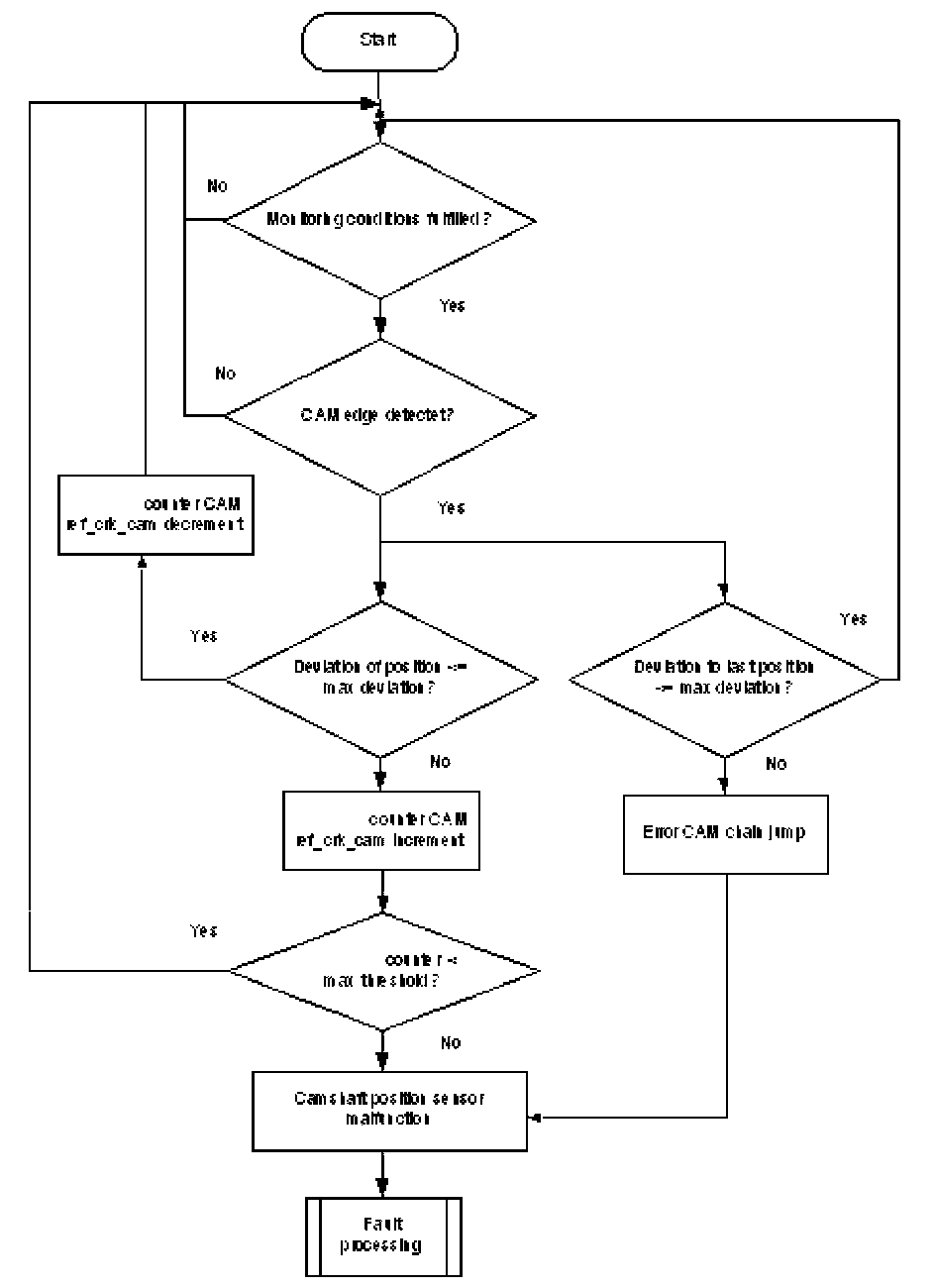 The monitor checks at least once per driving cycle the position of the camshaft in reference position compared to the crankshaft position. The deviation of all camshaft edges compared to the designed position is averaged. If the average value exceeds a max value, the corresponding counter is incremented. When the counter reaches a threshold the error CAM_ref_crk_cam is delivered to the error management.