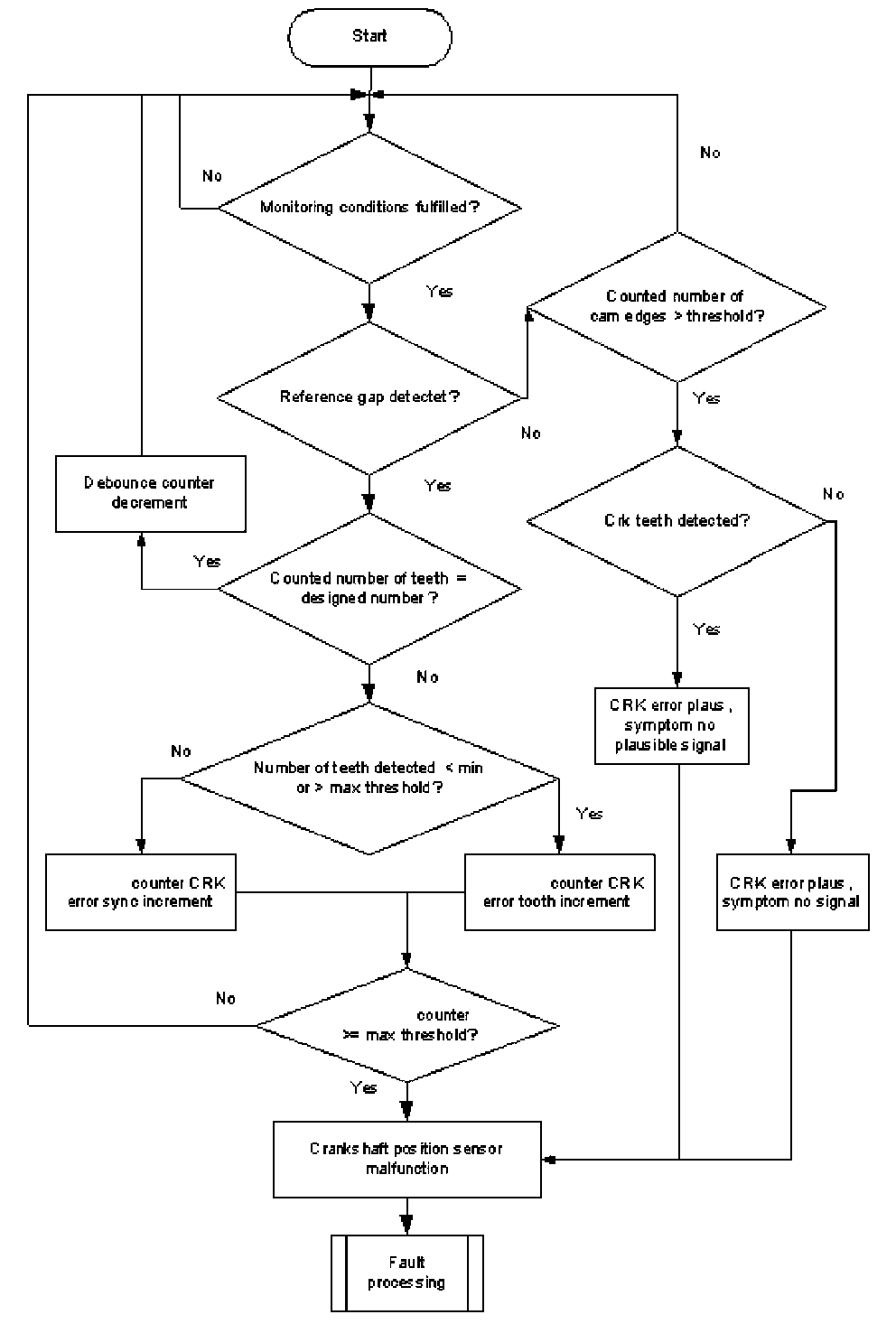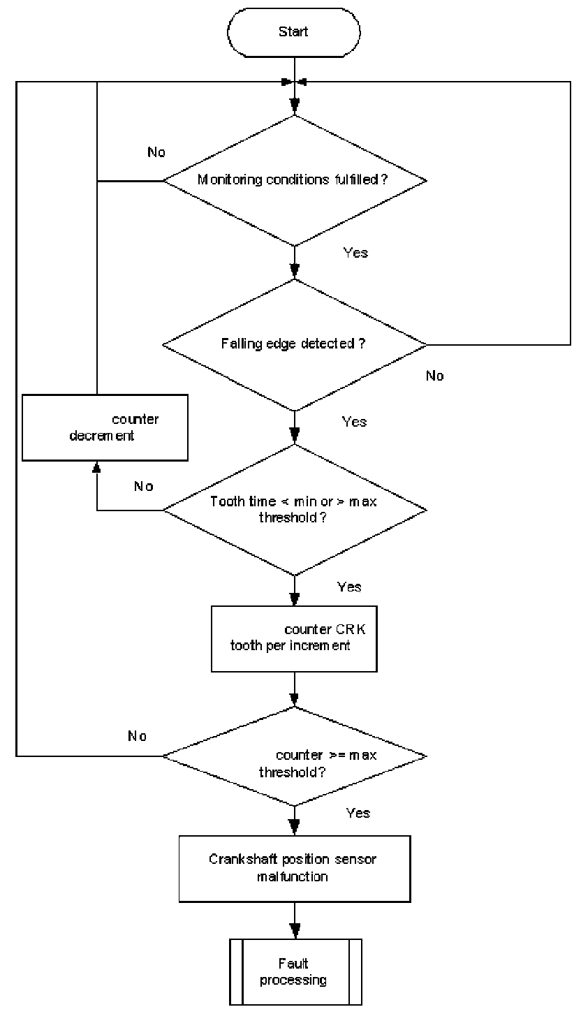 A teeth counter is incremented at every falling edge of the CRK sensor signal. If plus or minus one tooth is detected Flowchart diagnosis of mechanical reference position and diagnosis of chain jump. 360 °CA at the reference gap, the tooth number counter will be incremented. If the counter exceeds a limit, a CRK tooth error is delivered to the error management.