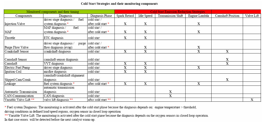 According to (e)(11.2.1), the individual component related to the above strategies has to be monitored. The table below demonstrates that all catalyst heating measures are covered by components which are monitored individually. The long term fuel system and the valve lift diagnosis, which need a lambda signal for monitoring, are finished after the catalyst warm-up phase. Errors will be detected before the next catalyst warm-up.