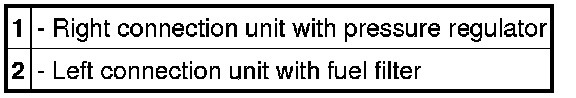 6. Carefully pull off the fuel supply line -1- at each connecting flange (right flange shown here) and loosen the two connection points -2 and 3-. Also remove line (not shown here) in vehicles with auxiliary heating (auxiliary heater). Do the same at the left connection unit. Unplug all connections on the connecting flange.