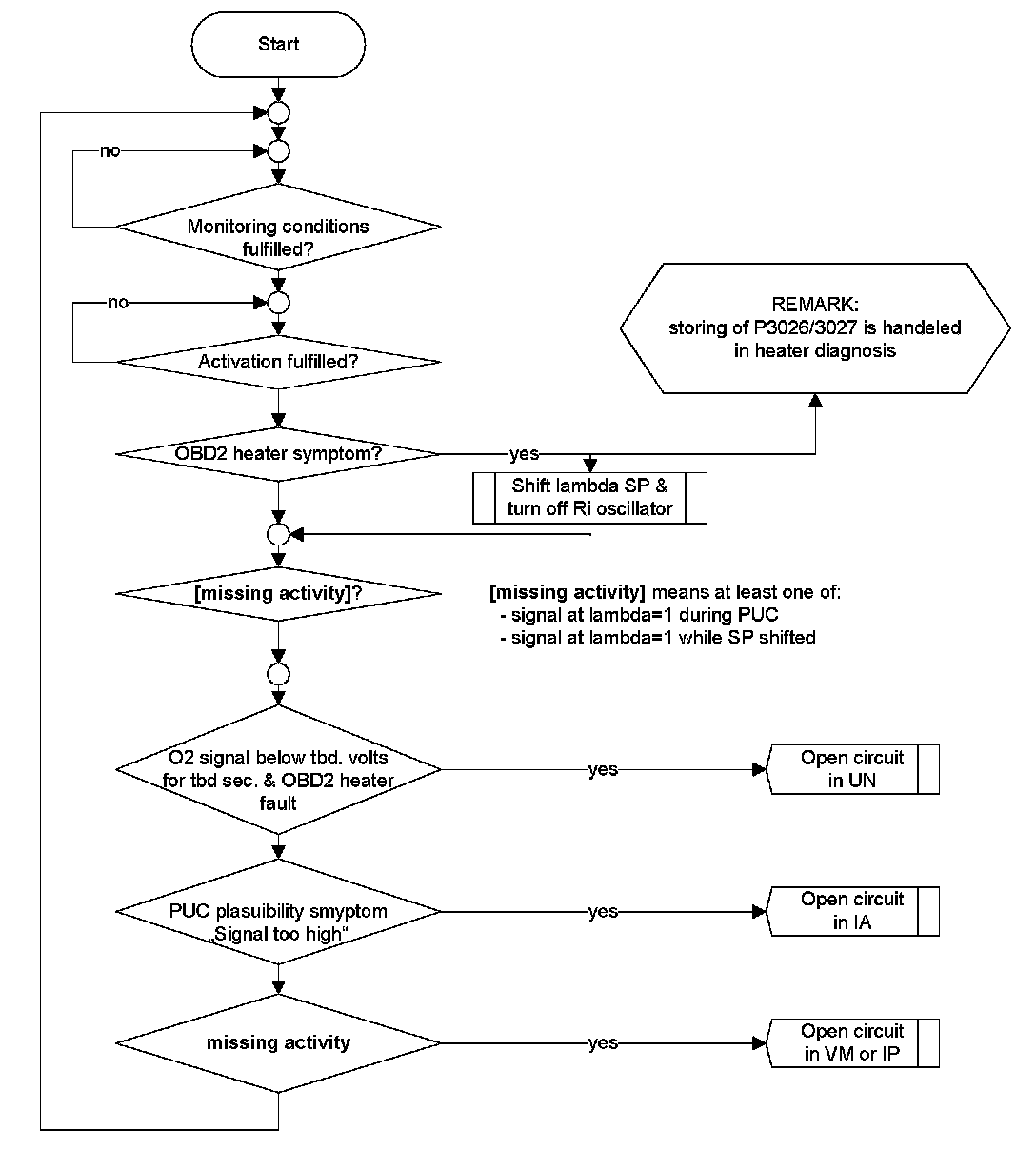 An open circuit in line Virtual Ground or in the line Pumping current can be detected if the sensor signal sticks near lambda 1. The sensor non-activity can be detected by the Oxygen Sensor Signal Monitoring During Fuel Cut-off (signal voltage below e.g. 2.1 V ) in fuel cut off or WRAF sens activity check.