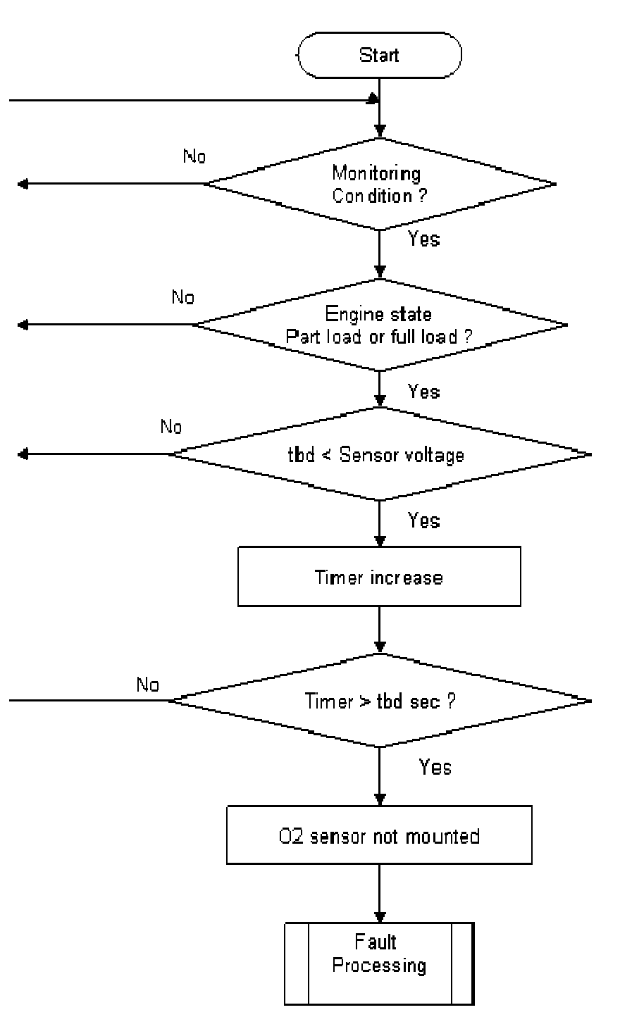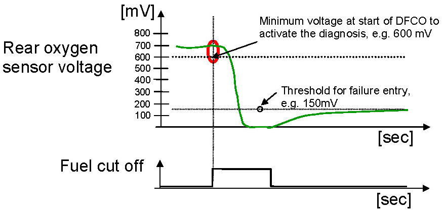 1. Part one monitors the downstream sensor voltage during active fuel trim controller p-share. If the fuel trim control is active, the downstream sensor voltage must be in a band around the trim control set point. If the voltage is outside this band, a mass air flow integral is incremented. If this integral is over a threshold, a malfunction is detected (see also picture below.). When the downstream sensor voltage will not switch to rich before the integral is over a threshold after a fuel cut-off phase, then this fault will be stored, too.