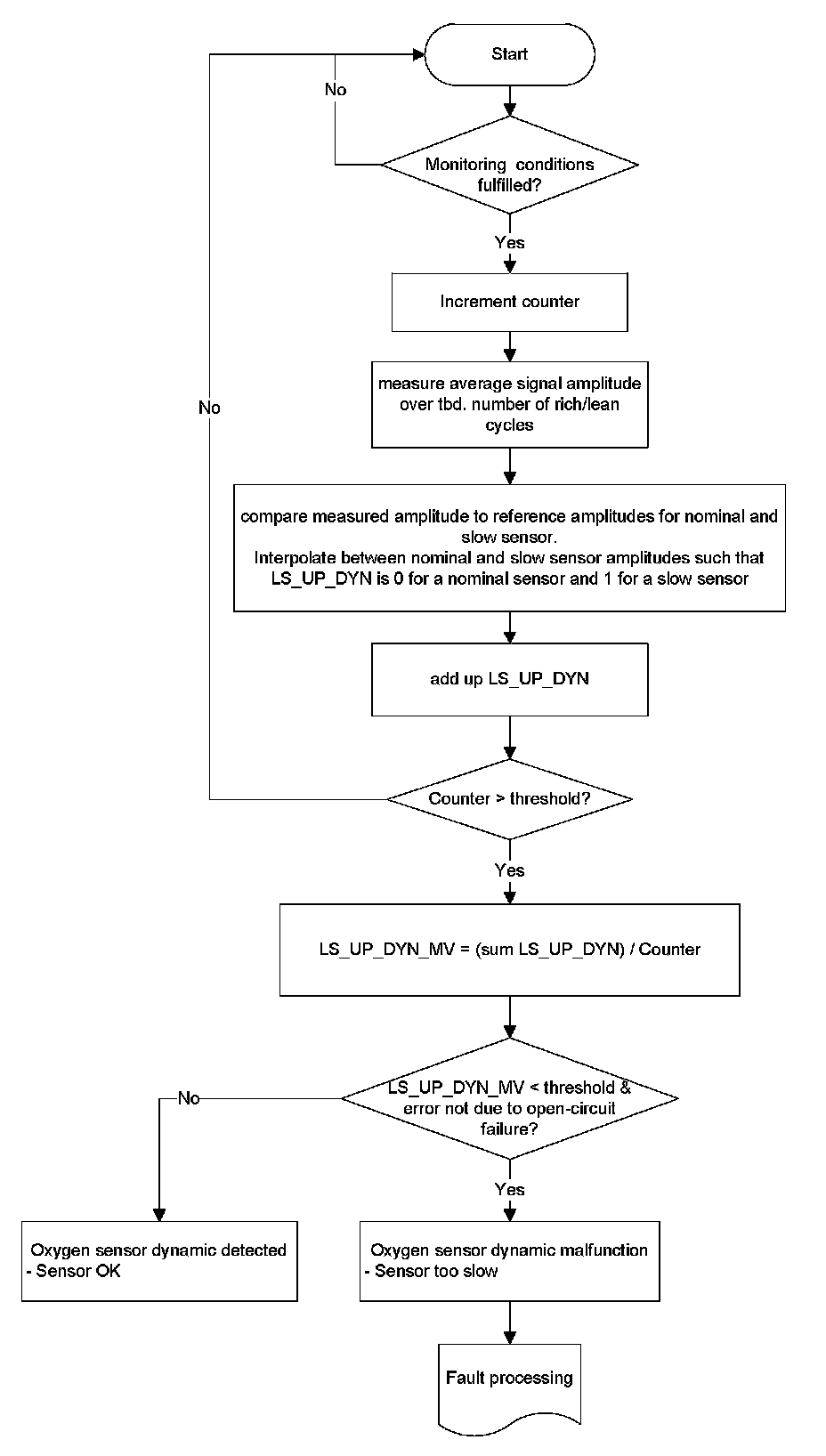 The oxygen sensor signal dynamic monitoring detects greater deviations of the dynamic behavior of the sensor signal compared to the nominal behavior. The change of the dynamic behavior is caused by problems of the electrical connection (e.g. open circuit), extreme aging of the sensor or a low sensor temperature which slows down the sensor compared to the nominal behavior.