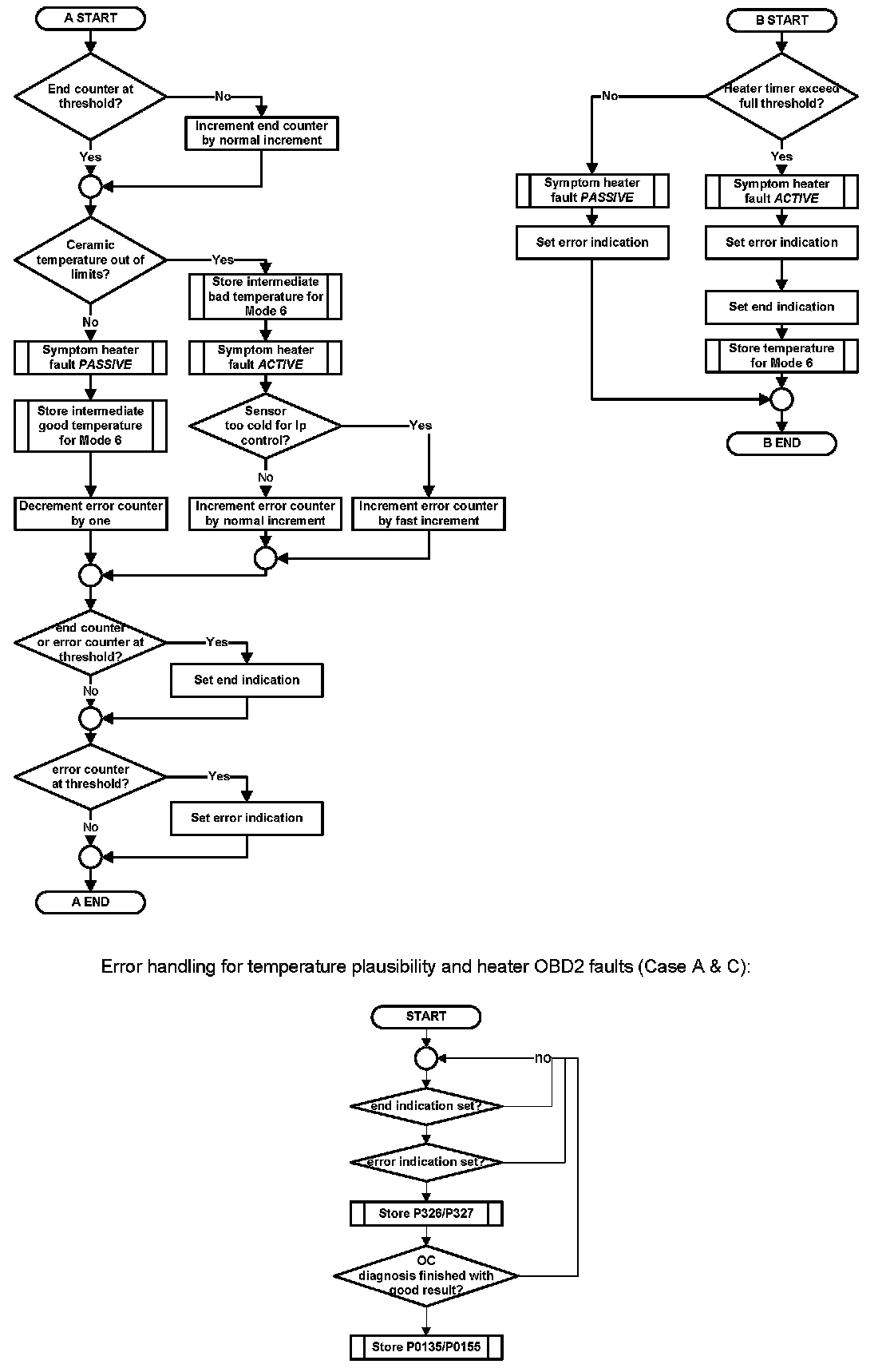 A low sensor temperature can be caused by a weak heater or a open circuit in the temperature measurement line (line UN). After a low sensor temperature has been detected, the general temperature failure is stored. Then the open circuit diagnosis is triggered to check, if an open circuit in line UN is present. If there is an open circuit, then open circuit fault code is stored (see 'Oxygen Sensor Monitoring - Open Circuit' and picture below). If there is no open circuit present, then the heater fault code is stored.