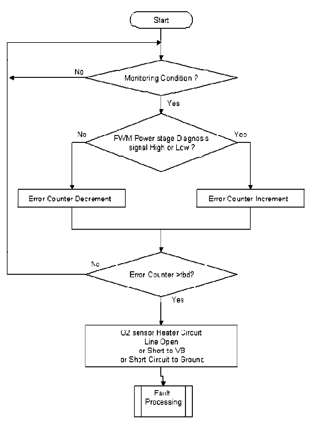 The purpose of this monitor is to detect errors within the O2 Sensor Heater Circuit. The signal for the O2 sensor heater is pulse-width modulated. The signal of the power stage is monitored internally by the driver. The driver can distinguish between three symptoms:
