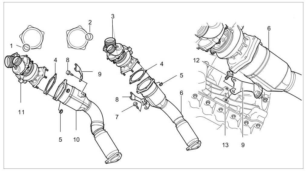 1. Fit right holder for primary catalytic converter on the crankcase. -9- => Tightening torque: 23 Nm (17 ftlb.)