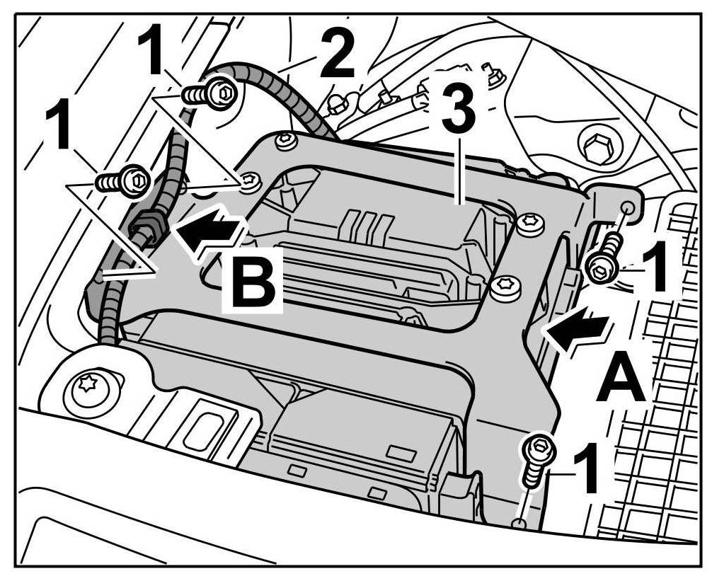 1.3. Move DME control unit and support -3- to one side -arrow B- until the connectors are easily accessible.