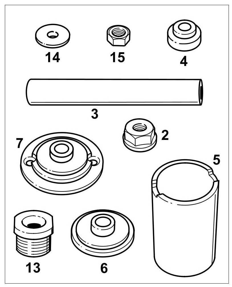 1. To fit the new bearing use the -pressure pieces- and tubular cylinder VAS 6178. No. 13 is screwed into the tubular piston cylinder. No. 2 is screwed onto the threaded rod and positioned in No. 13 for pressing in the bearing.