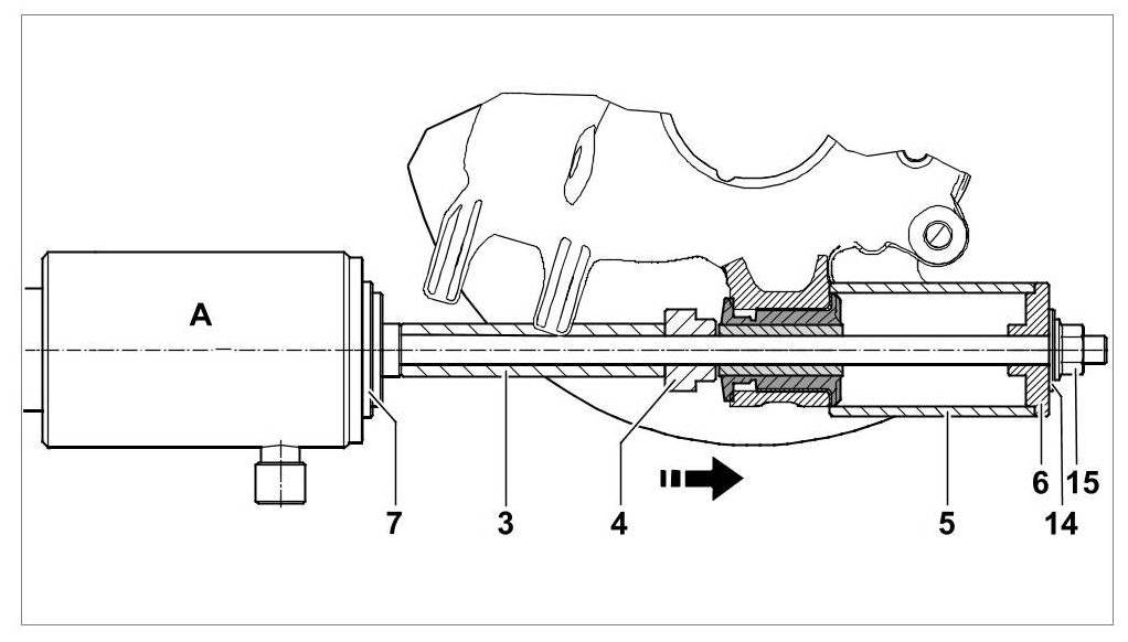 3. The pressure piece must be positioned correctly on the sealing surfaces of the wheel bearing housing. Now press the bearing in carefully. When doing so, stand to the side of the tubular piston cylinder and make sure that the tubular piston cylinder cannot fall down. Maximum assembling force must not exceed 30 KN at the stop.
