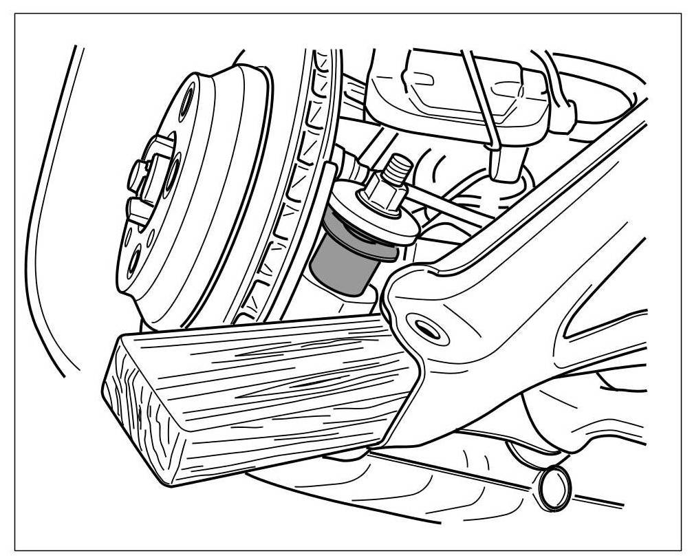 4. Press the lower trailing arm down further until a suitable spacer -see figure- (e.g. wooden block) can be inserted (makes removal easier).