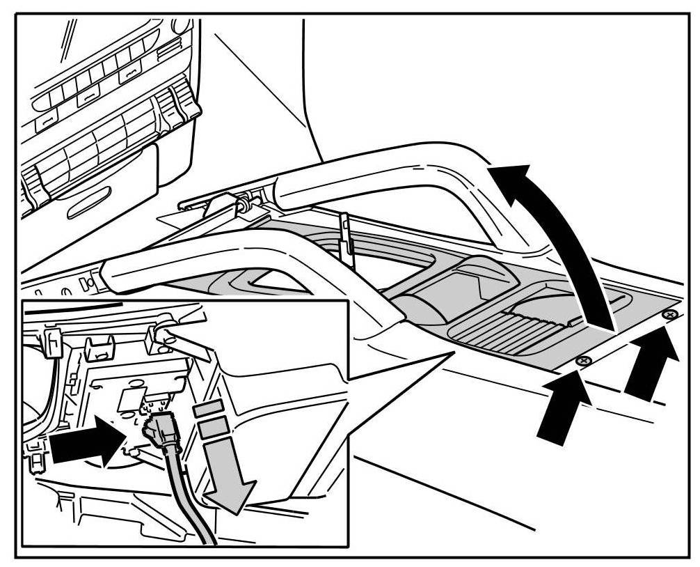2. Remove cover of centre console. To do this, unscrew two screws -arrows on right- , separate plug connection -inset- , tip cover up -curved arrow- and back, and remove.