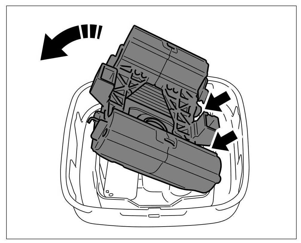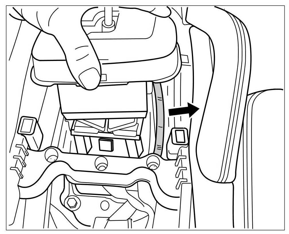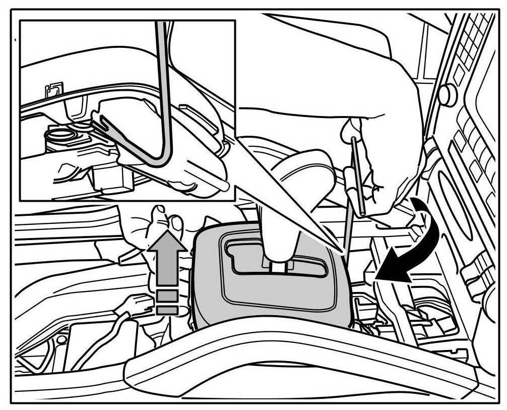 1. Release the lugs -arrows- on one side on the underside of the cover for the selector lever.