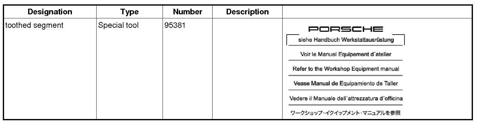 2. Block the drive plate. To do this, attach toothed segment 95381 to a threaded bore at the bottom of the oil guide housing so that at least one tooth engages with the ring gear. => Toothed segment