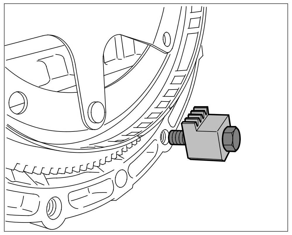 2. Block the drive plate. To do this, attach toothed segment 95381 to a screw hole in the crankcase so that at least one tooth engages with the starter teeth. => Toothed segment