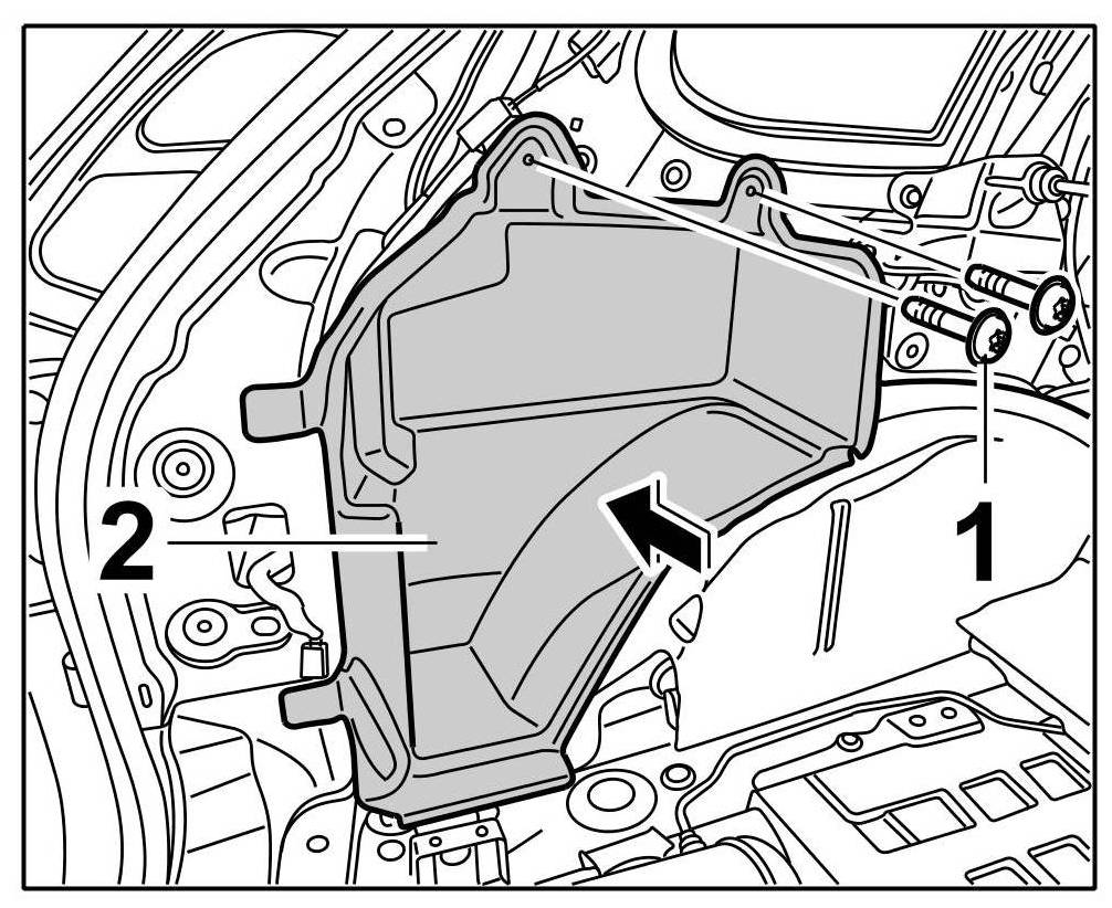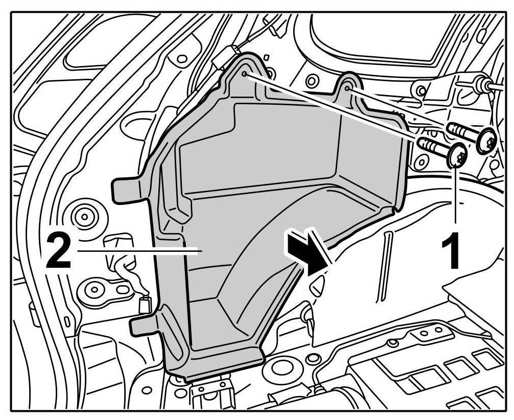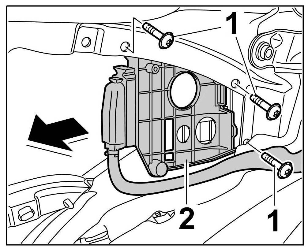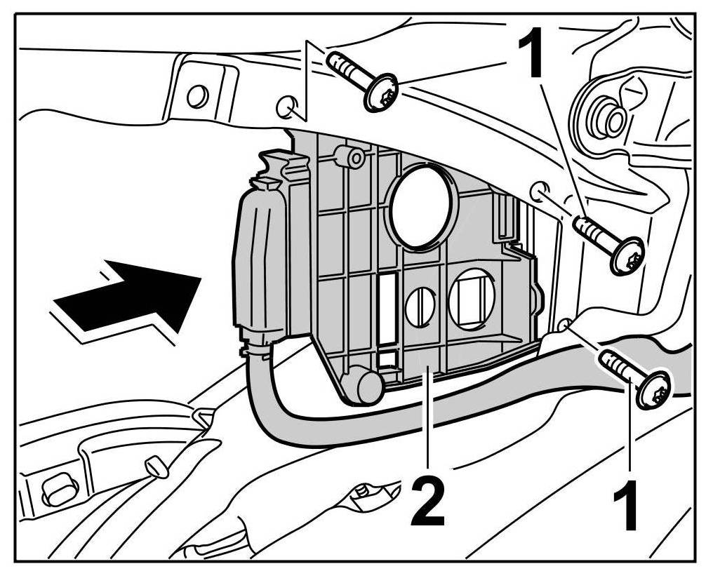 Position package box -2- on the body -arrow- and secure with the fastening screws -1-.