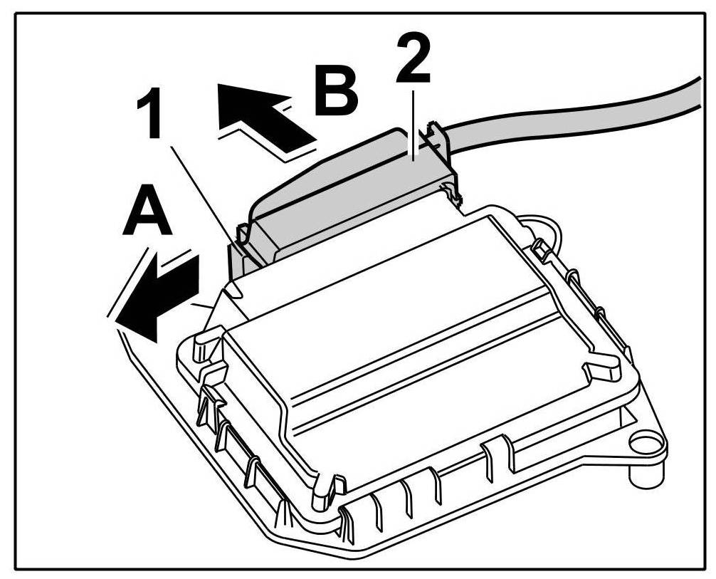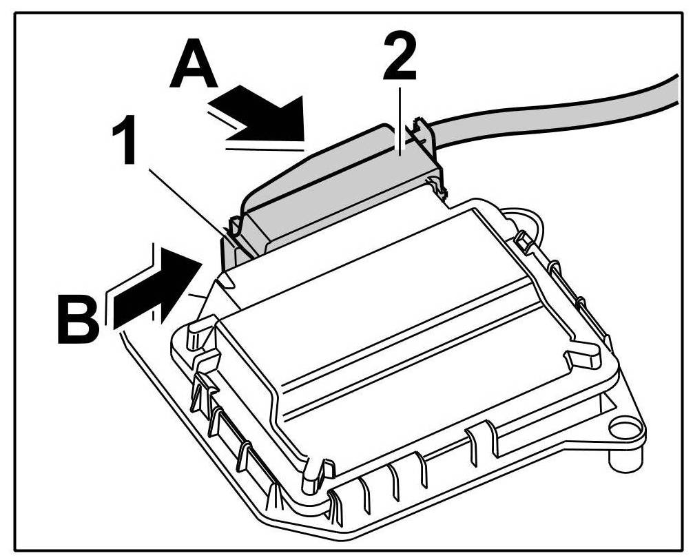 2. Plug in connector -2- ( -arrow A- ) and close the lock -1- ( -arrow B- ).