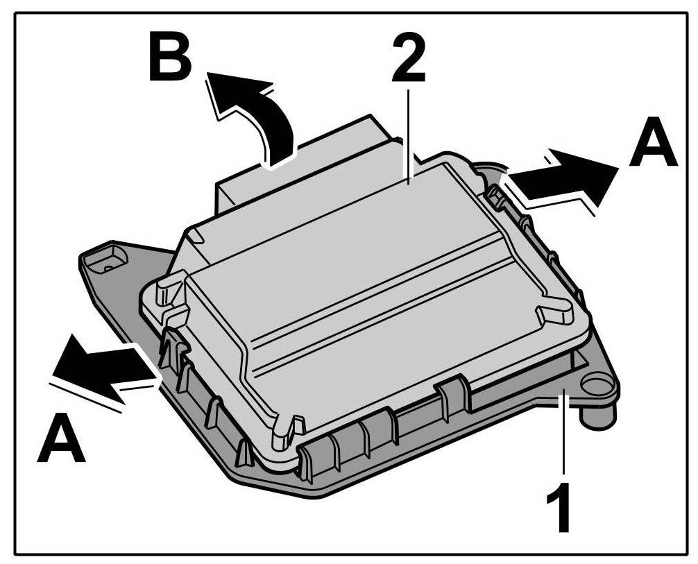 3. Release holder -1- at the two clips -arrows A- , lift up control unit for rear-differential lock -2- and slide it out -arrow B-.
